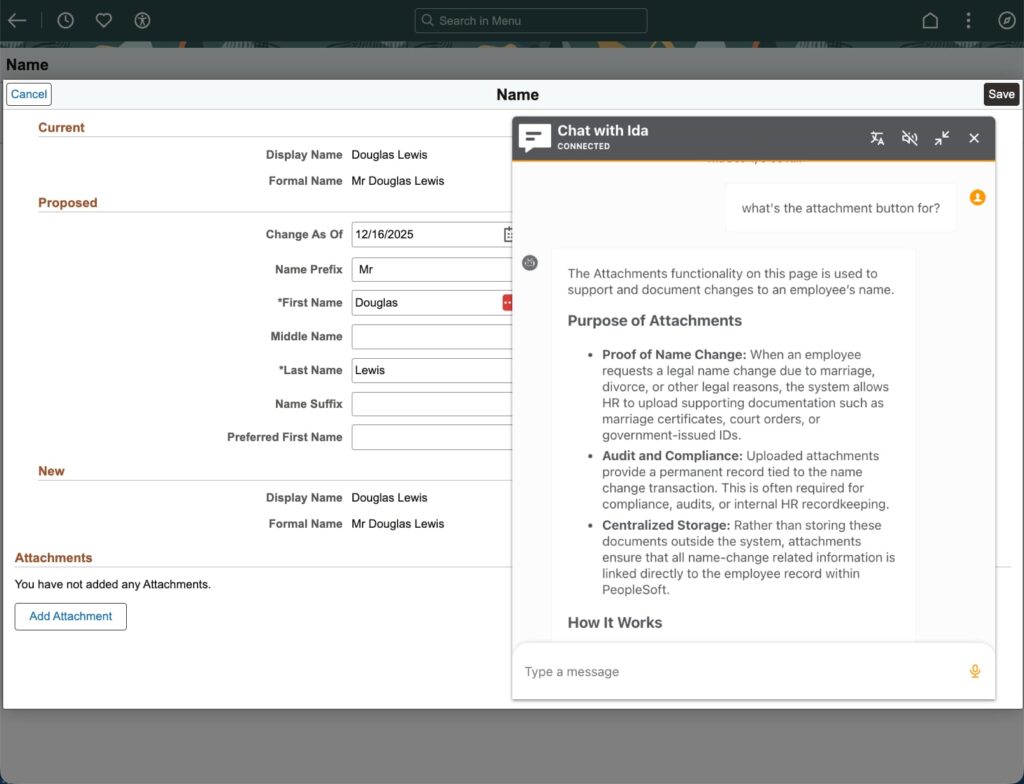 Ida’s new PeopleSoft Assistant feature in release 25.03 tackles that problem directly. Built in and included with Ida Pro and Ida Enterprise at no extra cost, this new feature delivers PeopleSoft AI Training right where it’s needed: inside the page.