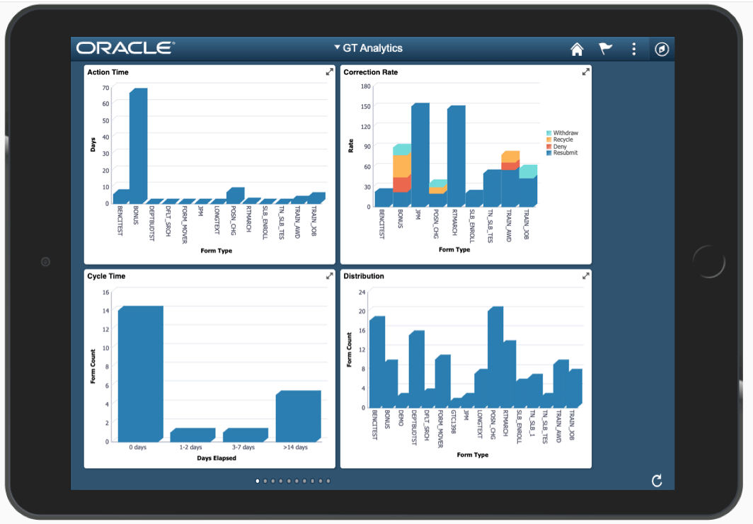GT Analytics provides a simple way to monitor the workflow queues associated with eForms. This powerful tool searches eForms based on criteria such as form type and status, date ranges, participants, etc. and shows summary charts and eForm details of the search results. Charts give a visual picture of your automated processes, with graphical comparisons to the broader organization.