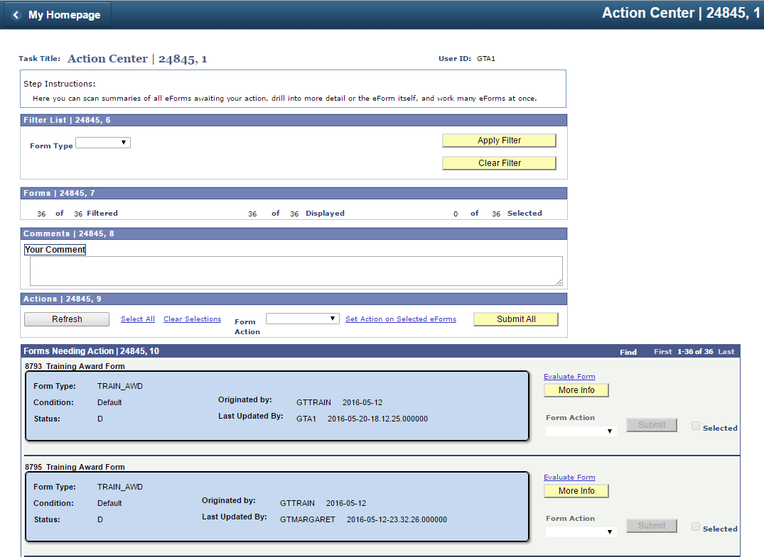 The Forms Needing Action group box displays a customizable summary of information for all forms returned by the filter. With support from developers, the GT Action Center is customizable to suit an organization’s needs, as outlined below. Since the GT Action Center is related to the worklist, worklist notifications must be set up on your form in order to have forms in the GT Action Center. Once a form has been removed, the Forms Needing action group box provides the opportunity to act on a list of individual forms in rapid succession. Alternatively, approvers can check the “Selected” box on each form they desire to take action on, then under the Actions group box, set the desired status in the “Form Action” field, click the link “Set Action on Selected eForms” (which updates the intended Form Action for all forms that have been selected) then click the “Submit All” button to complete the mass action.