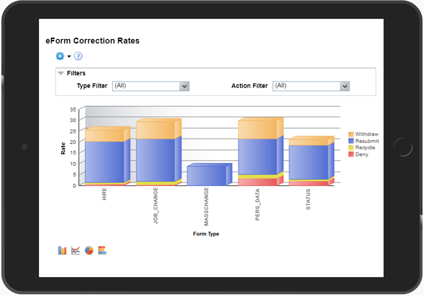 Shows the total number of times a form is denied, withdrawn, resubmitted, or recycled by form type. The report can be filtered by form type, action, and date range. A high count in one of these areas could indicate a need for more training or an updated form design.