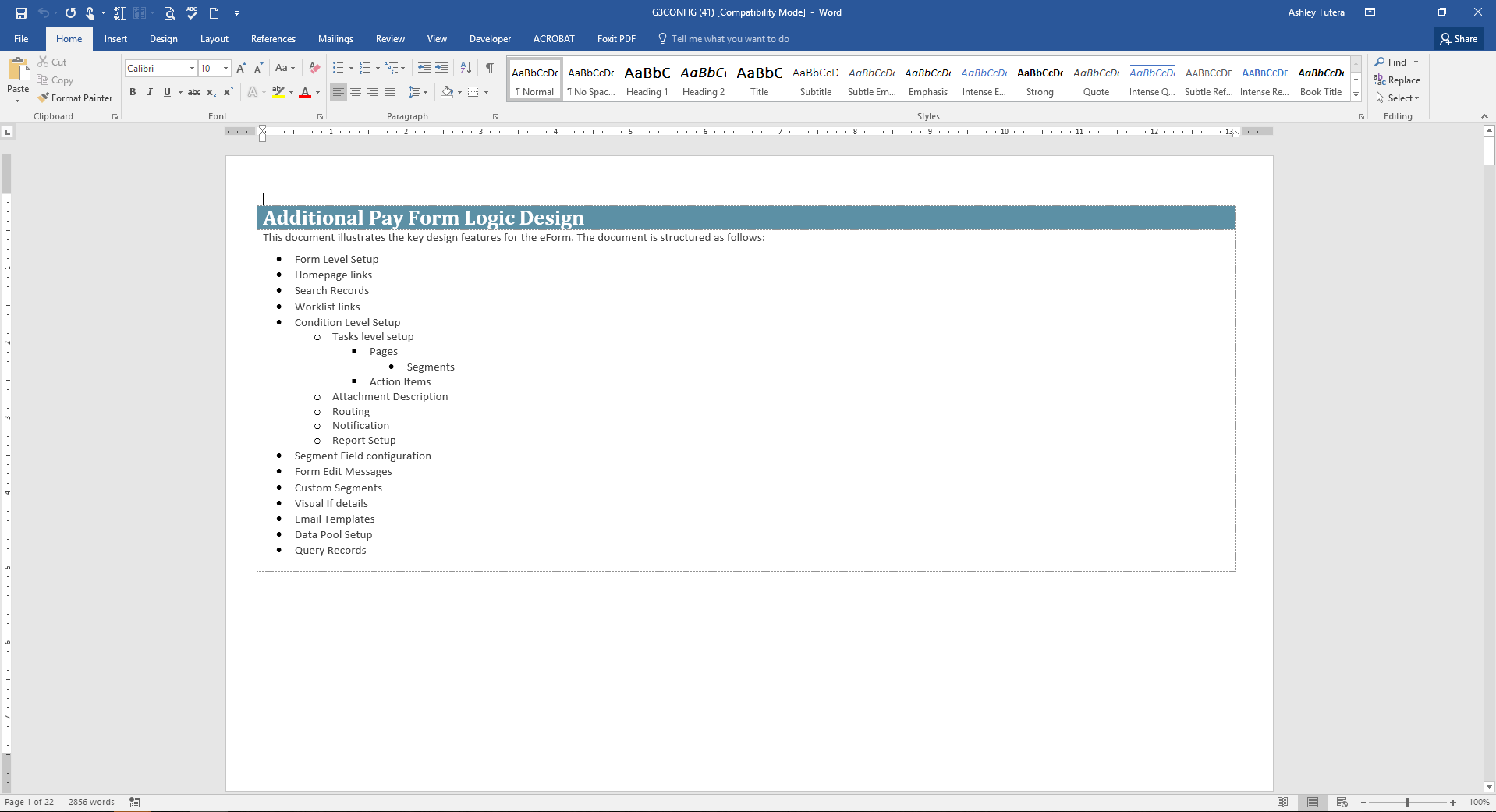 The component allows users with the specific GT Config Report User role, added during the installation, access see to list of all the form types you have in the current environment, regardless of the permissions applied using Participation Rosters. Once a user has identified the form type they would like a report on, they may click the “Generate Report” button and the .rtf file will download according to your preferences. Navigate to the download location and the report will be opened in Microsoft Word.