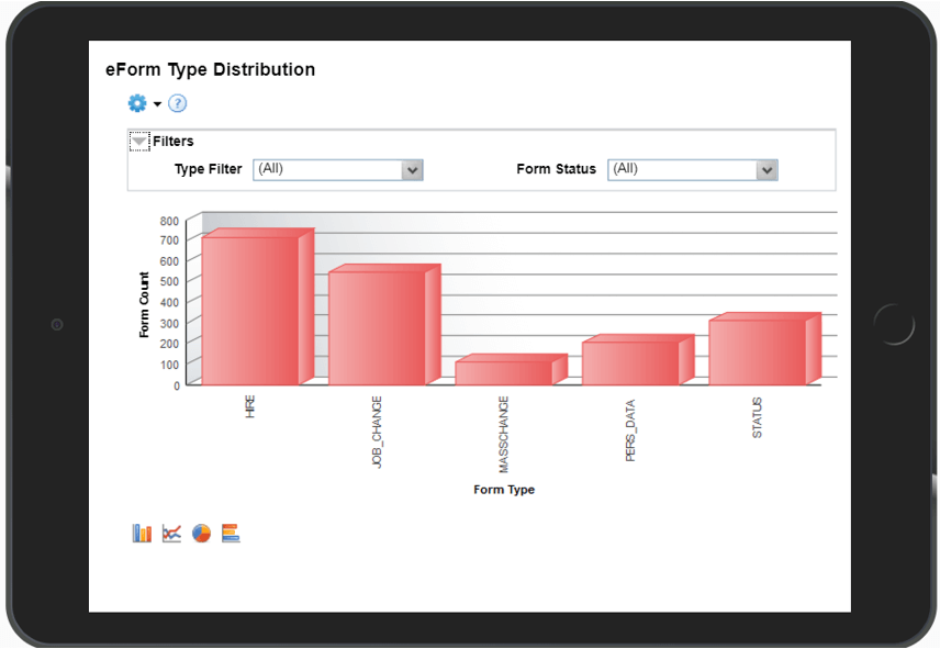 Shows total form count by form type. The report can be filtered by form status, form type and date range.