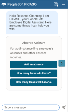 Picaso is the name given to the Chat UI widget (the actual window you chat in within PeopleSoft) which consumes multiple PeopleSoft delivered skills (from HCM and FSCM currently). Just like Workday’s or Salesforce’s chatbots, they are meant to extend the application’s functionality. PeopleSoft Picaso, however, is built on a far more powerful platform than the aforementioned products.