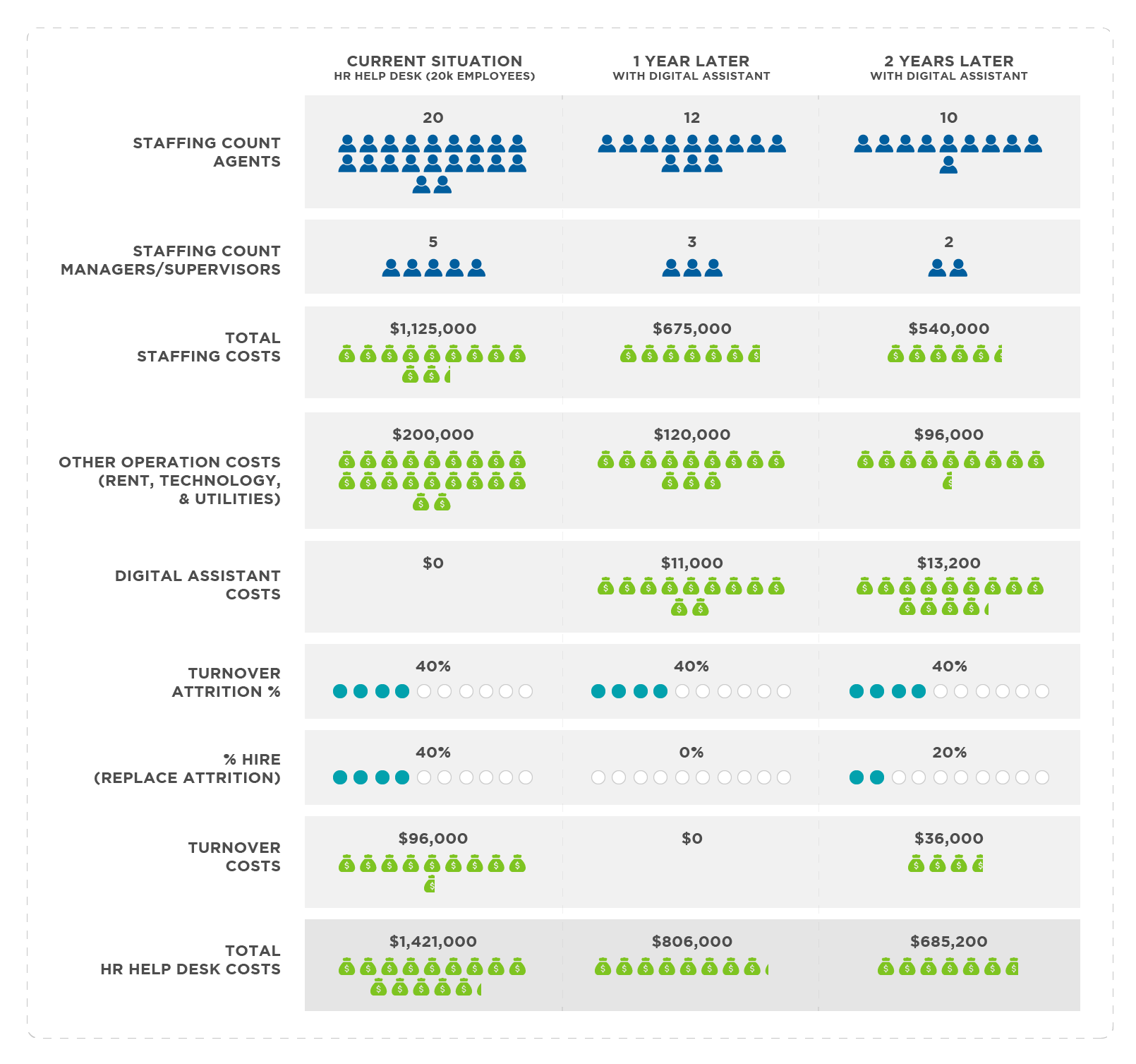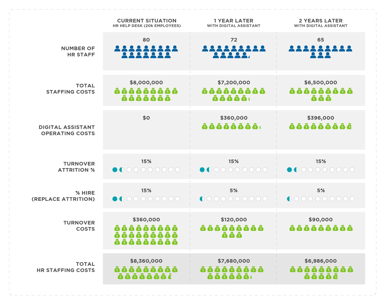 In this scenario, HR costs would reduce in year one from $8,360,000 to $7,680,000 as the new staffing level would drop from 80 to 72 (12 people would leave and only 4 new people would be hired). While at the same time digital assistant operational costs would amount to roughly $360,000 to cover the slack. So, the total net saving in year one would be $680,000 (excluding implementation and configuration costs). But with a huge potential for much bigger savings in future years.