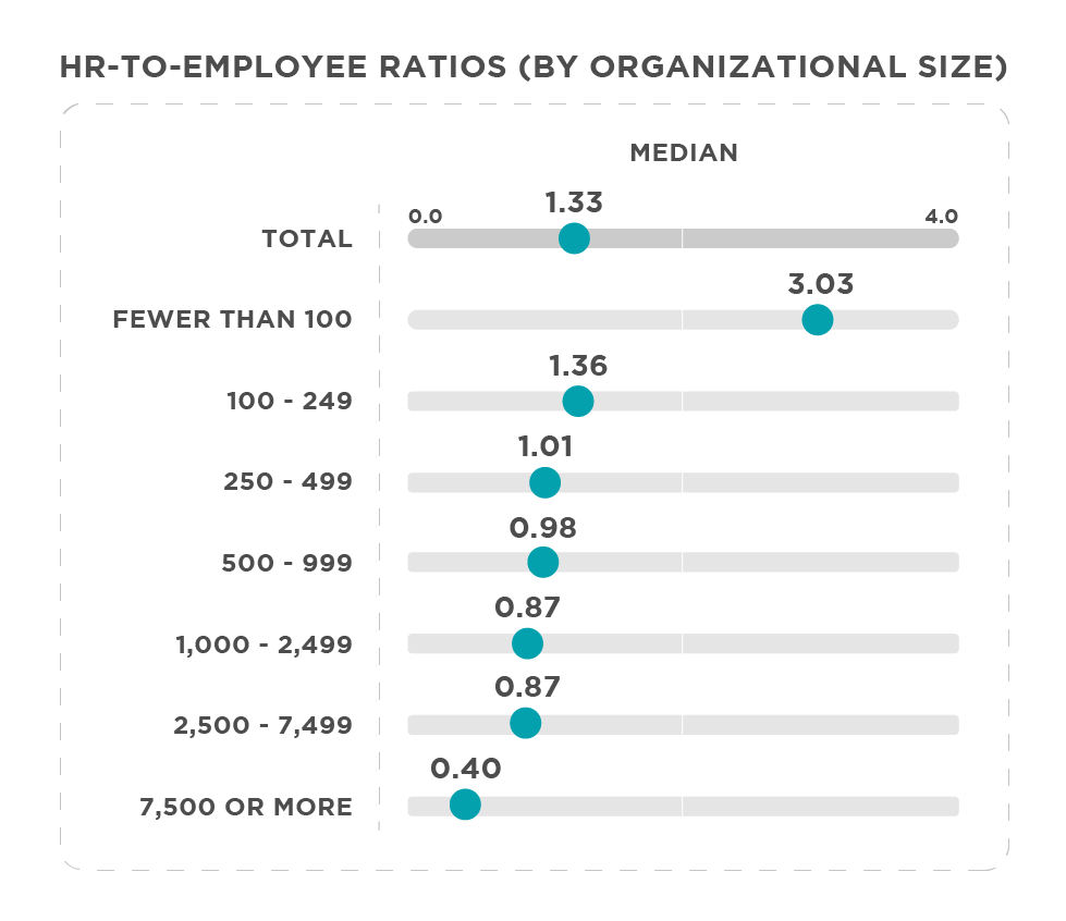 SHRM also noted a clear reduction in the ratio based on organization size (an economy of scale). However, as the size of the company rises, so does the average compensation to HR staff (which explains why published averages are very misleading). Working in HR for a large company can be twice as financially rewarding as for a very small company. The reason being complexity (on many levels). If you want HR people who understand complex organizations then you have to pay a premium.
